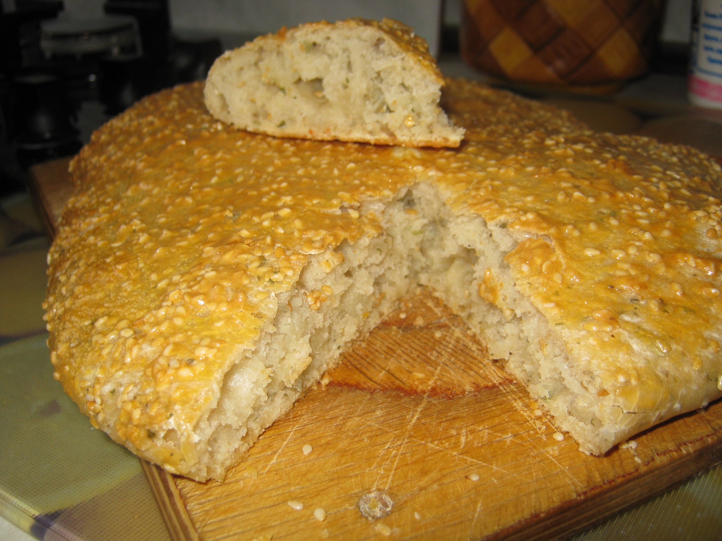 А вот и моя лепёшка готова! Я добавила смесь трав,щепотку сухого чеснока и чайную ложку оливкового масла. Соли 8 грамм много, в следующий раз положу поменьше и без трав, чеснока и масла. чтоб сам вкус ее понять. А эта очень вкусная и корка обалденная хрустящая :)