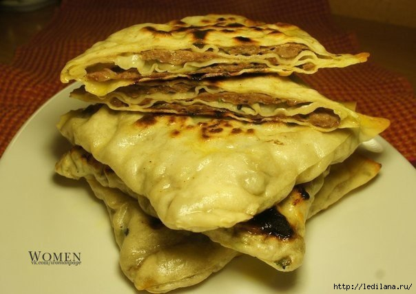 Для теста: Теплая вода - 240 мл Мука - 400 г Для начинки: Мясной фарш - 800 г Зеленый лук - 1 пучок Чеснок - 4-5 зубчика Соевый соус - 4 ст.лож Оливковое масло - 2 ст. лож. Имбирь свежий - 1 ст. лож. Водка - 2 ст. лож. Масло сливочное для смазывания лепешек Соль, молотый черный перец по вкусу Приготовление: Из муки и теплой воды замесите тесто.Накройте его пленкой, пока вы делаете начинку. Готовим фарш. Зеленый лук мелко порежьте. Чеснок и имбирь натрите на мелкой терке. Соедините все ингредиенты с мясным фаршем и тщательно перемешайте. Разделите фарш на 8 частей.Тесто также поделите на 8 частей. Каждую часть теста раскатайте в тонкую лепешку диаметром примерно 22-23 см. На нее распределите тесто закрыв 3/4 части лепешки. От края до центра сделайте надрез и накройте тестом 1/4 часть начинки. Теперь сверните накрытую часть так, что бы у вас получилась половинка круга. Теперь сложите лепешку еще раз пополам. У вас получится 1/4 часть круга. Слепите края теста. Каждую лепешку жарьте на сухой, горячей сковороде с двух сторон по 3-5 минут, под закрытой крышке. Горячие лепешки обильно смажьте растопленным сливочным маслом. |