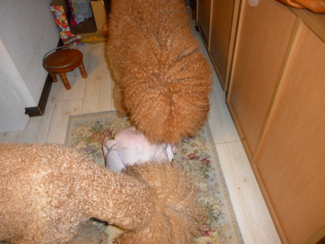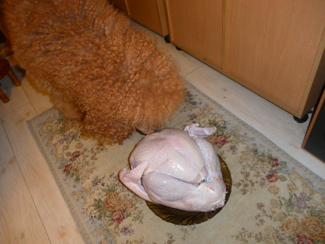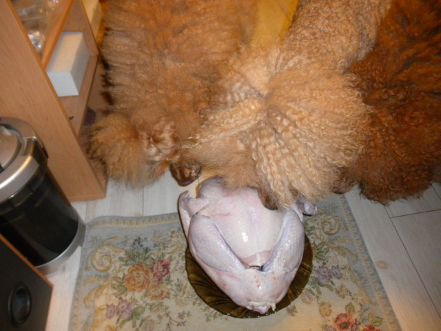 Читала, что крупным собакам дают их люди, про мелких - не в курсе. Купили вчера целую индейку. Главным образом из-за девчонок - хотелось их побаловать индюшатиной. А кусками тут не продают... Поставила им целую - девочки обалдели Но грызть начать попытались! Андромеда даже сказала Р-РРРР-РЫ.... чем несказанно удивила Венеру (у нас ведь такого никогда не было! )Ну, испытывать что дальше будет, я не стала. Отрезала от тушки нам куски (в тарелке горой лежат) , остальное порезала собакам (в раковине куски лежат). Кстати, удивительно какие крошечные у индеек сердце, печень и желудочек - такие же по размеру, как у курицы..... . _______________________________________