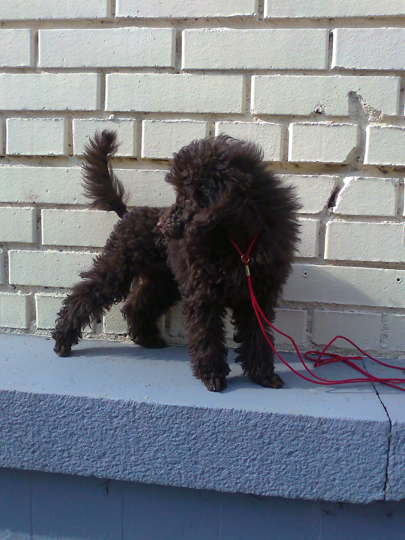 И вот виден этот наш бордюр, серый снизу, высотой примерно метр, узкий выступ вокруг всего кинотеатра. По нему у меня все собаки бегали и Даша очень любит. На фото ей 3 месяца и взрослая )