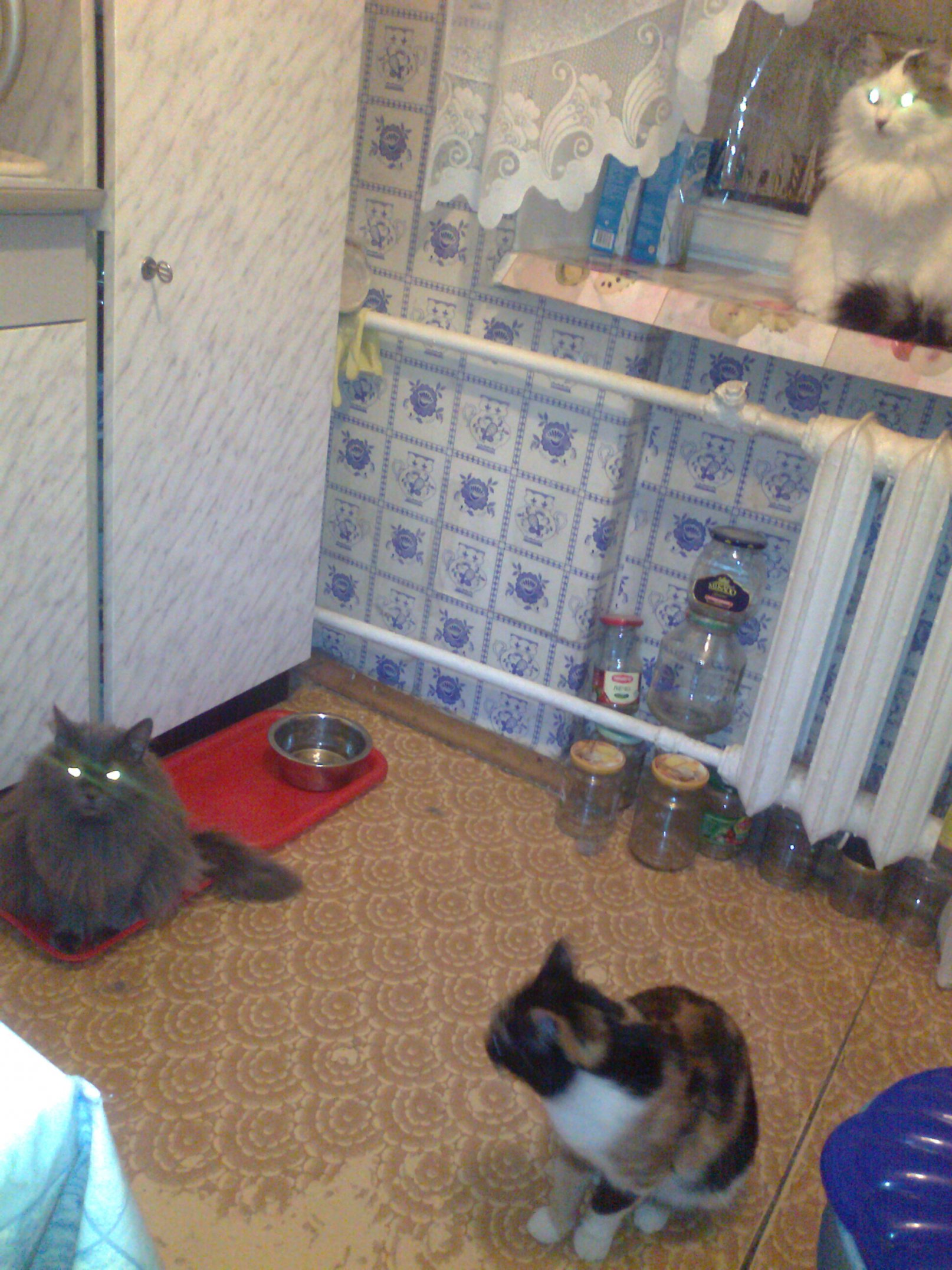 На подносе скромная Машка, на подоконнике злая Мурка и Анфиска, моя крестница ))) она с помойки, подруга ее кормила, пока та котенком была, в первую же течку она повязалась и как то подруга шла с работы, а та рожает. Ну они с матерью взяли и отвезли ее в клинику, как подруга говорит на аборт ))) Жалко ее стало, там ее стерилизовали и планировалось пристроить ее, но никому она не нужна оказалась, так и осталась у Любы жить. Сначала была дикая, всего боялась, пряталась. Я ходила ее лечила, сначала ловили ее долго, как только не выуживали из-под диванов и из-за шкафов. А теперь она такая стала толстенная, важная, не очень наглая конечно, до Мурки ей далеко, но тоже не промах ) А крестницей ее Люба называет потому, что кличку Анфиска я ей придумала.
