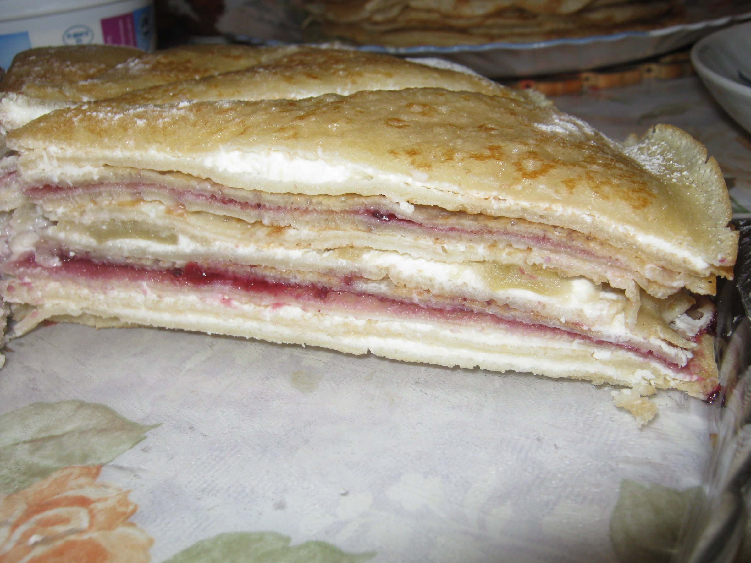 А еще я делаю блинный торт! Это очень вкусно! Начинку разную делаю, но больше всего люблю творожный крем и фрукты или сливочный сыр и семга слабосоленая. Сейчас найду фото прошлогоднего торта, в этот раз наверное не получится, если только завтра.