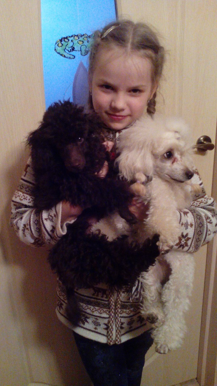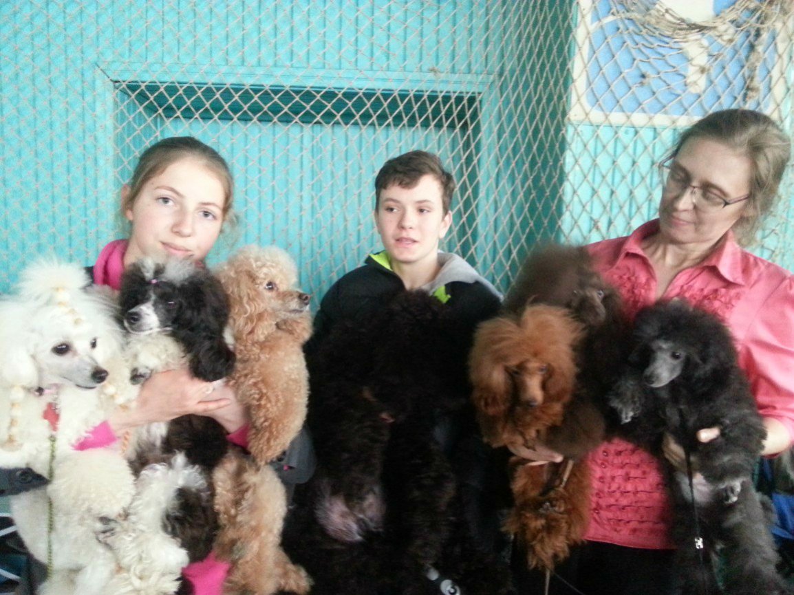Всем привет из Воронежа!:) Встретились с Ириной на выставке. у меня на руках мои Хлоя, Ероха и Каспер. В середине сидит щенок коричневого большого пуделя Руф, плохо видно его, а у Ирины Марсик Умка и Тори:) Пудлобукетики