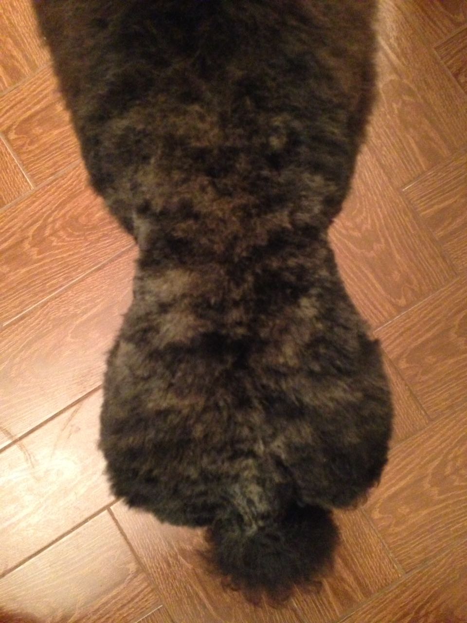 Крупный, совершенно охренительный, 6-ти, уже практически 7-ми месячный щен, отец с матерью обалденные, но сын!!! Лучше родителей, инбридинг на Гвен, окрас черный тигр, с палевым типингом на кончиках шерсти, будто покрыт тонкой вуалью. Аврора (мать), с пятнами серебристый тигр, папа черный, сын черный тигр, но из-за палевой вуали выглядит коричневым, пигмент черный, я такой окрас видела (без типинга) у французских бульдогов, у медведей ... Люди, у меня айфон, как с него фотки поставить не знаю, могу кому-нить выслать на мэйл, у кого есть комп и он сможет их поставить тут в приличном виде ... Это вид сверху. https://www.facebook.com/permalink.p...&id=1622380262 А, я чего-то похожее по окрасу видела у кошек - чёрная черепаха. Я думаю, этот палевый (абрикосовый) типинг у Салюта уйдёт с возрастом, во всяком случае, там где стригу постоянно - попу и брею морду, даже, когда обрастает типинга нет, так что, когда полностью сменит щенячку на взрослую шерсть, то останется только тигр, как на фото спины ... _______________________________________