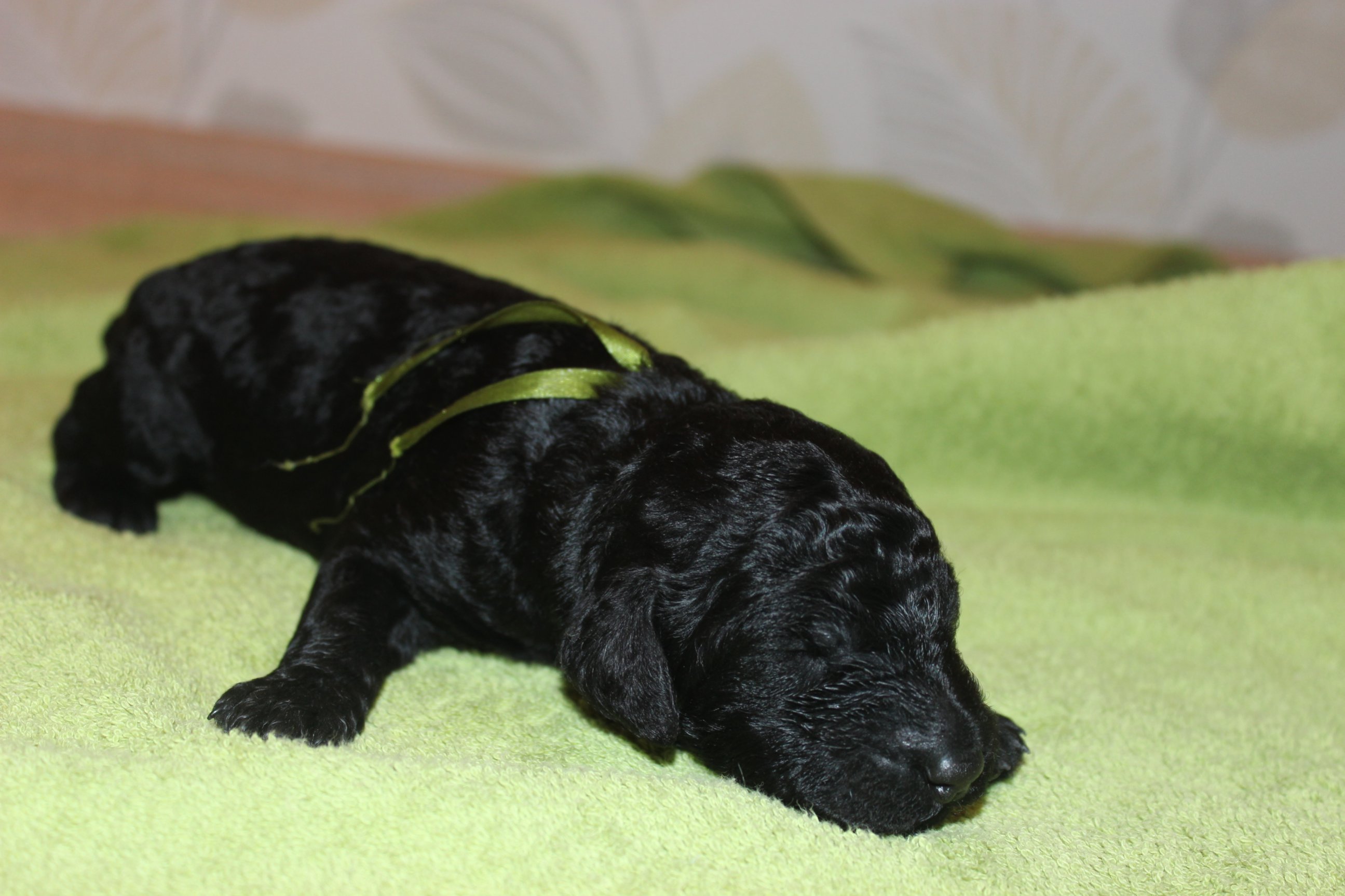 Итак, мы продолжаем наш репортаж из пуделинного семейства. Белый мальчик с зеленой лентой, Cheetah's white, юный Чет. Родившись после Черномора, он сразу понял-будет борьба и громко оповестил всех о своём рождении и о готовности к борьбе за лидерство. Поняв проигрыш по весу, тут же стал усиленно кушать, чтобы войти в одну весовую категорию с братом и теперь от него не отстаёт. Он твёрдо знает, чего хочет и всегда об этом сообщает своим пока ещё милым "ав-ав". Но пользуется этим он не часто, ибо "сладкий сон его манит", да и кто не любит поспать после сытного обеда?