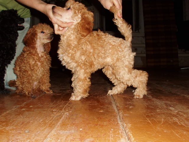 нормальные щенки, от красно-абрикосовой вязки...от абрикосовых вязок помета "А" у нас рождаются как яркие, так и светлые щенки абрикосового окраса. Здесь добавился красный, так как мама красная...Что такого криминального с расщеплением, хоть убей, не понимаю... есть щенок одного окраса (красного) и двух оттенков другого (абрикосового)