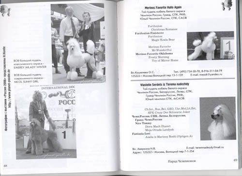 У меня появился вопрос. Почему на моих фотографиях стоит логотип вашего сайта? А не моя фамилия, логотип моего питомника? Получается затем не очень хорошо, т.к. мною снятая и предоставленная фотография для вашего сайта выдаются за принадлежащие Вам. Да, на Вашем сайте рядом с фото была написана моя фамилия, а затем...Вот опубликованная фотография в журнале "Пудель-ревю" №17/06 (стр 48 ) - фотография EMEREI MILADY WINTER. Фото этой страницы прикладываю. Ни в коей мере я не хочу ссорится с Вами, но этот вопрос необходимо решать. Вот надпись, расположенная слева: "Фотографии с выставки "Россия-2006" предоставлены Н.Колбе http://www.planet-poodle.de" _______________________________________