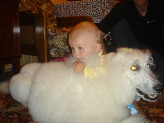 . У меня сейчас как раз щенки большого белого пуделя и там есть фото с ребенком которому 1г и 2 мес. ладят великолепно. |