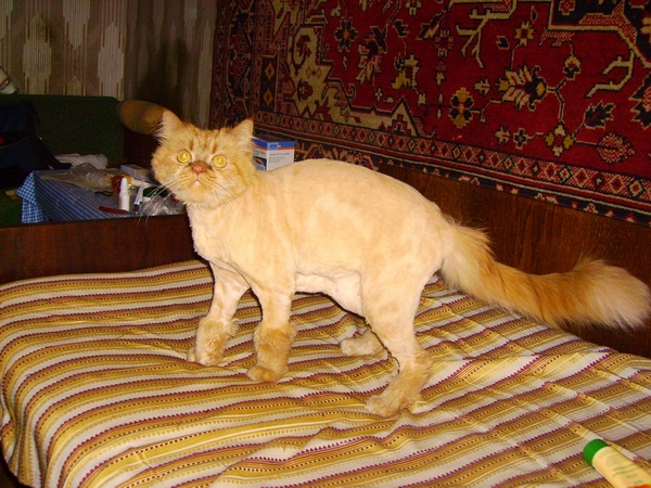 :)) а я очень люблю котиков стричь:) одно удовольствие, даже с буйными:) я их минут за 40 делаю:) я бы у вашего котика, побольше бы сняла шерсть с хвостика....и оставила бы только кисточку....скажем см 5 от кончика хвоста, остальное под машинку.... и границу на лапках , я бы сняла филеровкой чтобы сравнять переход от длинной к короткой, тогда смотрелось бы аккуратнее:) а у вас сколько ушло времени на стрижку? |