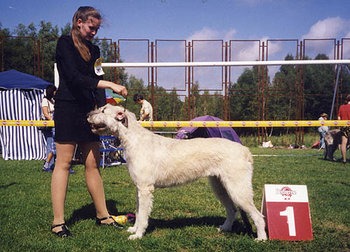 Powerscort’s California Dream «Дима», который был и остается для меня идеалом ирландского волкодава. Он был точно такой, как я видела на Американской выставке, по кассете с которой училась видеть и выставлять эту породу. Димка выиграл здесь все, о чем можно мечтать: в 15 месяцев ВОВ «Евразии» и 3 место в группе, затем были победы на Международных выставках, на монопородных, в группах. За всю свою карьеру он лишь однажды уступил в сравнении на лучшего кобеля и трижды его обходили суки (2 раза – его будущая жена, что поражением не считается;) ). Все! Остальные выставки он выигрывал вне зависимости от экспертизы и наличия конкурентов. Собака-мечта, шоу-боец и отличный производитель. На фото:Powerscort’s California Dream - BIG, ему полтора года |