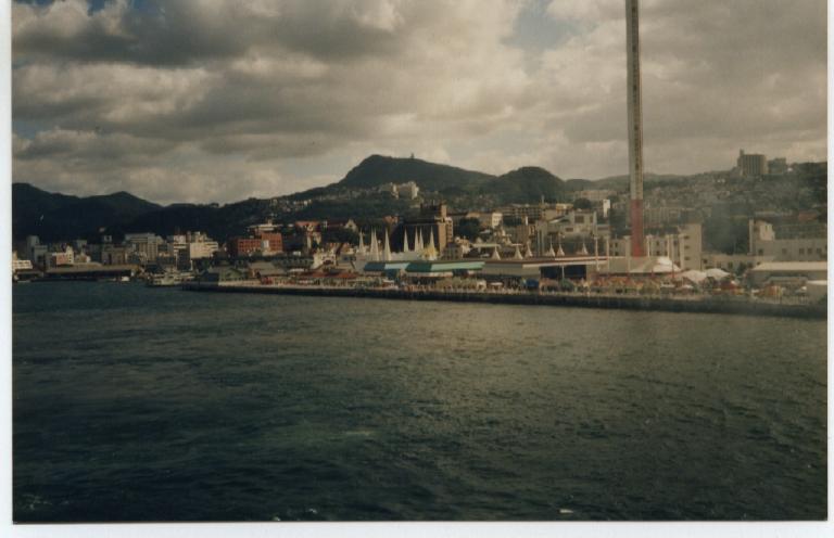 Продолжу тему.Здесь уже был репортаж о Нагасаки.Вот еще немного.Фото были сделаны в 1990 году в октябре простой мыльницей.Была поездка на огромном теплоходе " Русь".Заранее извиняюсь за качество фотографий. Вид с моря.