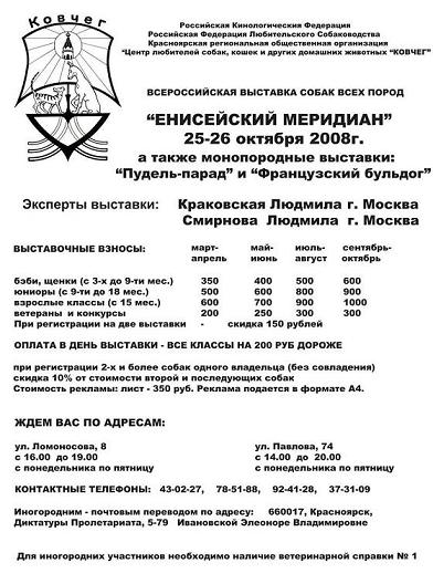 http://dolceshow.ucoz.comОбычно всю подноготную о твоей собаке знает твой конкурент......("Опыт, сын ошибок трудных......") Последний раз редактировалось Kenia1976; 26.10.2008 в 20:11. |