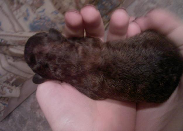 Фото сделано на телефон, поэтому качество плохое. Нет, это не тигровый окрас. В первый момент показалось, что подпал только на боках, как и в прошлый раз, и на шее. Но когда щенок подсох, стало видно, что она вся вот такая рыже-черная, соболиная. Ну, и как теперь? Это плембрак считается или соболиный разрешен? Но я думаю, что она перецветет в серого, как и ее полусестра - тетка.