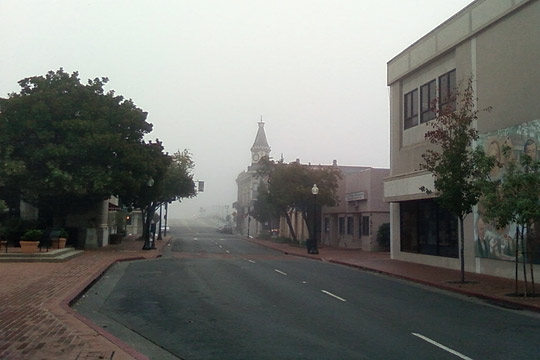 Пока все дремлют, повешу еще пару фотографий. Центр Напы, раннее утро субботы. Городок спит, только пара туристов уже вскочила и волочит свои 6 ног в самую гущу тумана в поисках чашечки кофе... :)