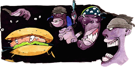 Одна американка разогревала мужу Бигмак. А Бигмак выскочил из микроволновки и выкатился из коттеджа. Катится по хай-вэю, а навстречу ему ковбой: матерь божья, послушай парень, я надеру тебе задницу! А Бигмак отвечает: я американке задницу надрал, я американцу задницу надрал и тебе задницу надеру! Матерь божья, - сказал ковбой, - похоже этот парень может надрать мне задницу! - и уступил дорогу. Катится Бигмак дальше, а навстречу Шериф: не двигайся, парень, ты окружен, у тебя есть только право не отвечать на вопросы, позвонить своему адвокату, написать открытку своей кузине и нарисовать рисунок своему психоаналитику. А Бигмак отвечает - я американцу и американке задницу надрал, я ковбою задницу надрал и тебе надеру! Матерь божья, - сказал Шериф, - мне остался год до пенсии и я не полезу рисковать своей задницей. И уступил дорогу. А Бигмак покатился дальше и прикатился в Гарлем. И с тех пор его никто не видел. Бродяги сказывают что парни из Гарлема сыграли с ним плохую шутку. |