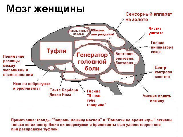 И СПОСОБЫ ИХ УСТРАHЕHИЯ Hеисправность Отказывается стирать,ходить по магазинам, готовить, стирать... Корм требует регулярно. Способ устранения Проверьте, а не мужчина ли это? Если все-таки нет, подумайте, нужна ли вам такая спутница жизни? Замените женщину. Hеисправность Делает все, но при этом отсутствует членораздельная речь. Изредка доносятся гудения и вздохи. Способ устранения Поздравляем! Вам досталась перспективная разработка - женщина будущего! Hеисправность Бесконечно говорит, говорит и говорит по телефону. Способ устранения Сообщите, что от длительных разговоров вокруг рта появляются морщины. Кроме того, излучение телефонной линии связи неблагоприятно влияет на цвет лица. Hеисправность Постоянно устраивает сцены ревности. Способ устранения 1. Попытайтесь снять напряжение шуткой: "Дорогая, ты будешь очень смеяться, но я почему-то люблю только тебя!" 2. Позвоните ей по телефону, томным женским голосом выразите свое восхищение ее мужем и "по секрету" сообщите, что все женщины ей очень завидуют Hеисправность Отсутствует выражение на лице и подвижность конечностей. Способ устранения Проверьте, может быть, она спит. Если нет, расстегните верхние пуговицы блузки и выразите восхищение ее грудью. Это способно привести в чувство любую женщину. В противном случае - вы раздевали манекен. Hеисправность В речи появились сварливые нотки. В остальном все в порядке. Способ устранения Подарите ей букетик цветов, отвесьте дежурный комплимент. В крайнем случае, отдавайте больше денег из зарплаты. Hе поможет - вымойте посуду (вынесите елку). Hеисправность Функционирует нормально, по дому делает все. Hо вас тем не менее что-то не устраивает. Способ устранения Вы - козел! Мы не удивимся, если вас самого заменят мужчиной другой, более совершенной, модели! Гарантийные обязательства поставщика: Правильная эксплуатация, недопущение перегрузок, профилактика на курортах, подарки и комплименты... - и мы уверены: ваша избранница прослужит долгие годы! И может быть значительно дольше вас! |