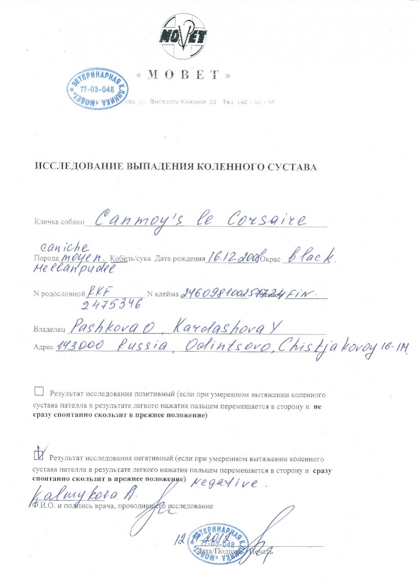 Сегодня в Московской вет.клинике "Мовет" мы сделали тест на колени нашему малому кобелю Canmoy's Le Corsaire