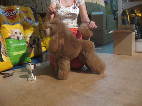 ПУДЕЛЬ МИНИАТЮРНЫЙ Современный окрас Кобель. Класс чемпионов 356 ДЕЛИСС СЕРПАНТИН УМБРИЭЛЬ (красн) (Делисс Серпантин Эльдорадо х Делисс Серпантин Фантастика) вл. Филоненко-Чоповская, Омск CAC, CACIB, ВОB Сука. Класс чемпионов 357 МЭДЖИК МИСТЕРИ МАЙА МЕЛИАН (красн) (Делисс Серпантин Умбриэль х Мэджик Мистери Ювеналия) вл. Филоненко-Чоповская, Омск CAC, CACIB фоток с ринга нет - фотограф бегал по кругу без фотика, но с пуделями))) только вот такое, не очень пристойное - возле наградного ринга на фото ДС УМБРИЭЛЬ