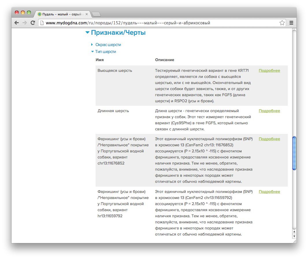 Там два раздела: "генетические заболевания" и "генетические признаки/черты". Furnishings отнесены к чертам, подраздел "тип шерсти".