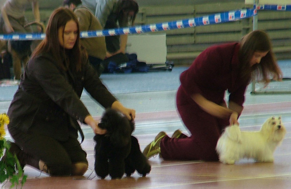 3-я в девятке на одной из выставок и 3-я в девяке на другой! Участников было завались - 2 выставки в один день и куча монопородок. За выставку она сменила 4 хендлера и вела себя великолепно, даже мне посчастливлось подержаться за ее поводок, судите сами... |