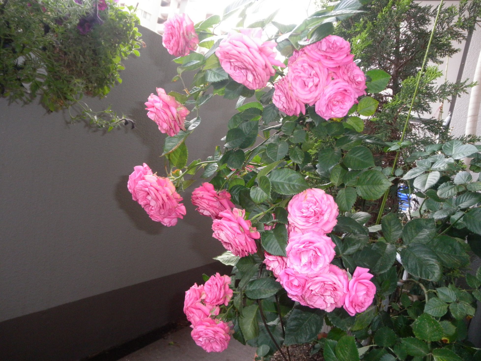 Роза на балконе цветёт такими гроздьями, что аж ветки ломаются под тяжестью пучков бутонов.