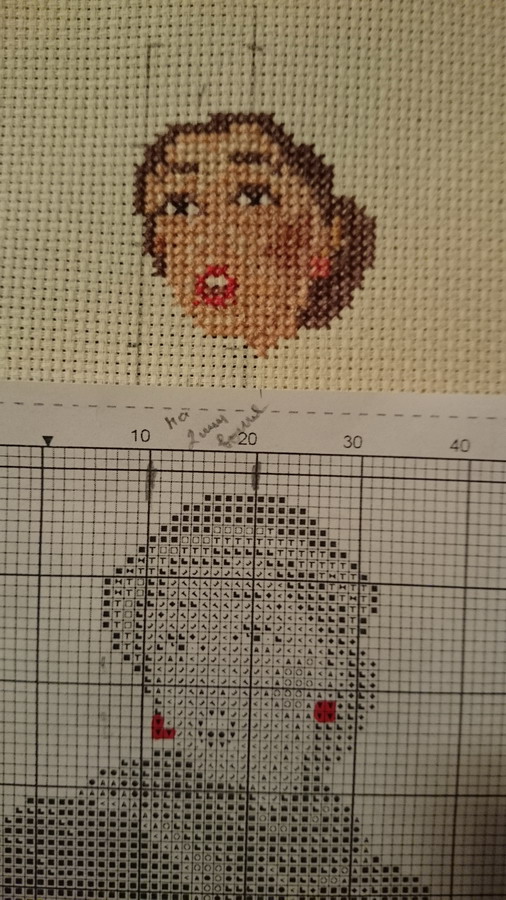 Я сегодня закончила вышивку, фуф, даже не верится и как-то грустно. Расскажу поэтапно о процессе. О третьей вышивки в моей жизни. Сначала я купила просто нитки и бежевую канву (не знала, что она рекомендована голубого цвета). Потом решила, что хочу крестик скомбинировать с бисером. Девочки консультанты в магазине рукоделия подсказали мне, что сначала лучше все вышить крестиком, а потом остальное бисером. Так удобнее. И так, все необходимое было куплено (как оказалось процесс вышивания затягивает, и хочется приобретать какие-нибудь удобности для этого, по-этому покупки на этом не ограничились))): Я решила сделать разметку карандашом, оказывается так и надо делать, это очень удобно: Первым вышила лицо дамы: Потом приступила к ножкам: _______________________________________