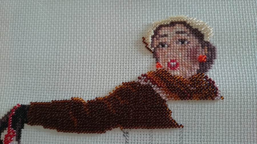 Первые пришитые бисеринки (очень красиво, но оказалось сложнее для меня, чем крестик): После туфель, был вышит поводок, серьги, часть шапки(мне хотелось побыстрее везде начать вышивку))) и перешла очередь к шубке: Для удобства, пришлось купить рамку-пяльцы (еле удержалась от покупки подставки): Как в последствие оказалось, одна кисть была вышита не на том месте, а от нее уже вышила значительную часть рукава из бисера, пришлось все распускать и разбирать бисер по цвету. _______________________________________