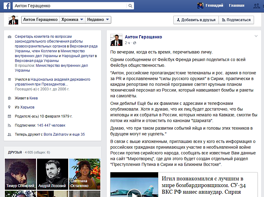 Советник министра внутренних дел Украины Антон Геращенко предложил публиковать информацию о военнослужащих РФ, участвующих в операции против ИГ, в помощь желающим отомстить им экстремистам. «Думаю, что их лиц будет достаточно, что бы игиловцы и их собратья в России, которых немало на Кавказе, смогли бы, потом их найти и отомстить по канонам «Шариата»… В связи с выше изложенным, приглашаю всех у кого есть информация о российских гражданах… сообщать все известные Вам данные на сайт «Миротворец», — написал Геращенко на своей странице в Facebook. Оригинал новости RT на русском: https://russian.rt.com/article/121796 _______________________________________