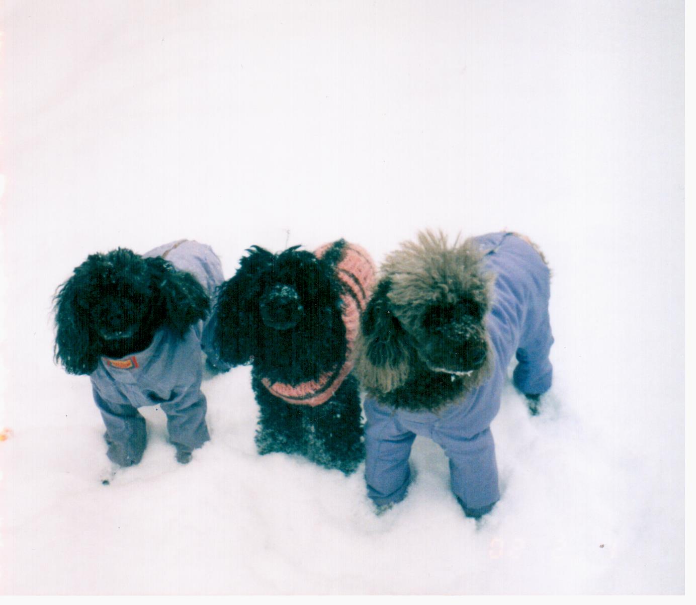 А вот тут моя "святая троица" в сборе :) Слева Чика посередине Дора и справа мать их Герда. А на зимней фотке слева Герда, потом Чика и Дора. Розовая жилеточка на Чике - подарок моей клиентки, она сама связала кофтейку эту.