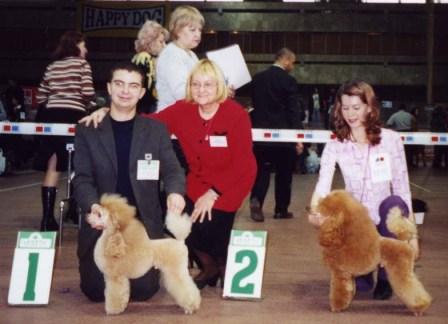 Правда, на этом фото запечатлен момент, когда она отдала CACIB нормальному абрикосу с Ромочкой, а ярко-рыжему кобелю ее давней "пшияцюльки" Нинки Масленниковой достался только RCACIB.... Но так было не всегда. Очень она любила молодого ярко-красного Киспаса и почти всегда ставила его первым...