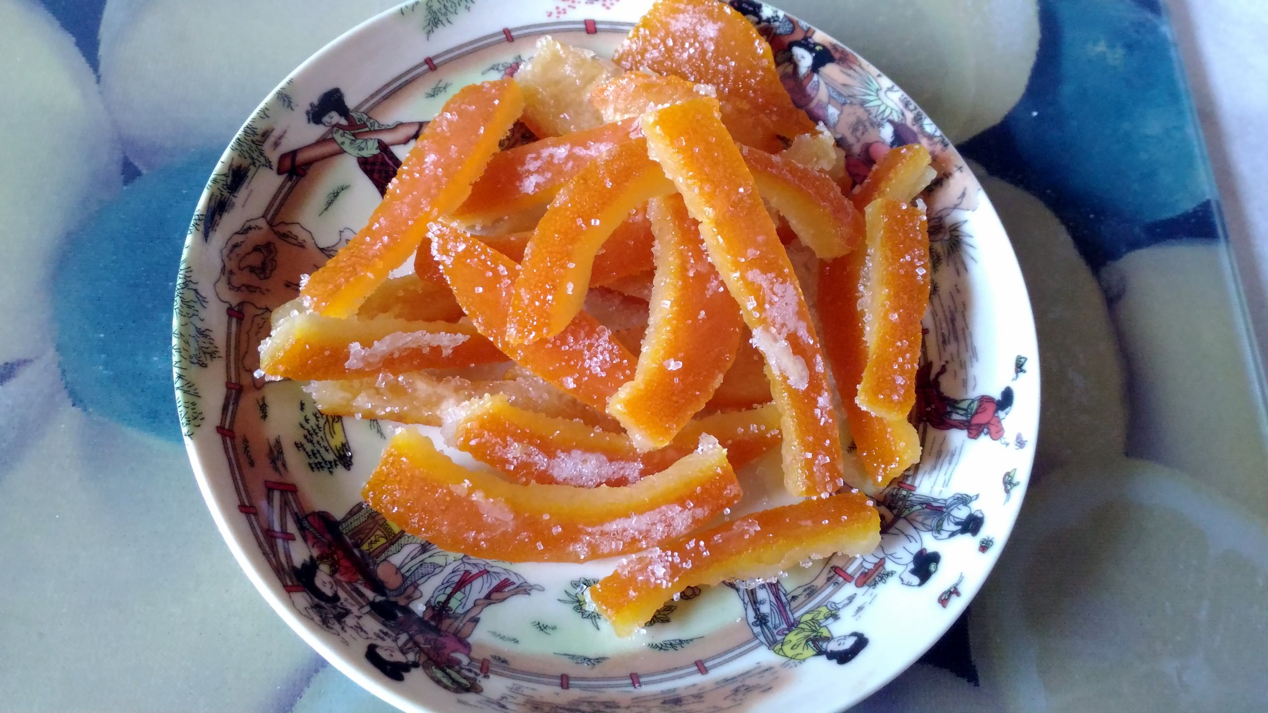 Татьяна, это из апельсиновых корок цукаты, с одного апельсина. Сделала по первому попавшемуся в инете рецепту. Корки нарезала полосками, промыла холодной водой, сложила в ковшик, залила холодной водой, после закипания варила 10 минут, потом слила, промыла, снова залила холодной водой, опять после закипания 10 минут варила. Потом промыла, залила холодной водой и добавила немного соли, буквально щепотку, поварила 10 минут и еще раз слила, промыла, залила и с солью. Всего в воде 4 раза по 10 минут варить получается. Потом промыла, выложила в тарелку, в ковшике сварила сироп, сахар пол стакана и воды треть стакана, как закипел, туда корки, варила еще полчаса в сиропе. Потом на пергамент, подсушила ночь, утром перевернула, еще немного подсушила и посыпала сахаром. По мне, так они слишком мягкие получились, наверное можно варить три раза, но тогда может горчинка остаться. В этих тоже есть чуток, но прям так ненавязчиво и приятно горчит ) По мне, так не хватает чуть чуть кислинки. А вообще удивительно, вот сколько варила, а вода каждый раз так сильно пахла, неубиваемый аромат прямо таки.