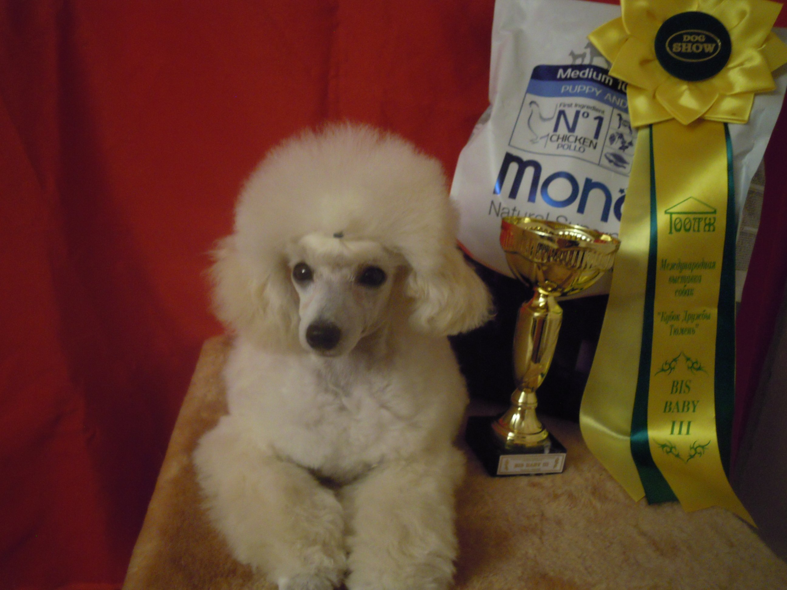 Won Best of breed baby and BISS Baby -3!!!! Judge Mach Lisbeth and Natalja Shalin. Cood like litle boy(Bragabout Jike Jake is I CH.Multy CH.BIS and BISS Winner+Nevskaja Zhemchuzhina Platina Parma is JGH.CH of Russia). Описание:оч. маленький белый кобель идеального телосложения имеет классическую голову.отл. пигмент .отл. движения.ОЧЕНЬ СЧАСТЛИВ В РИНГЕ. |