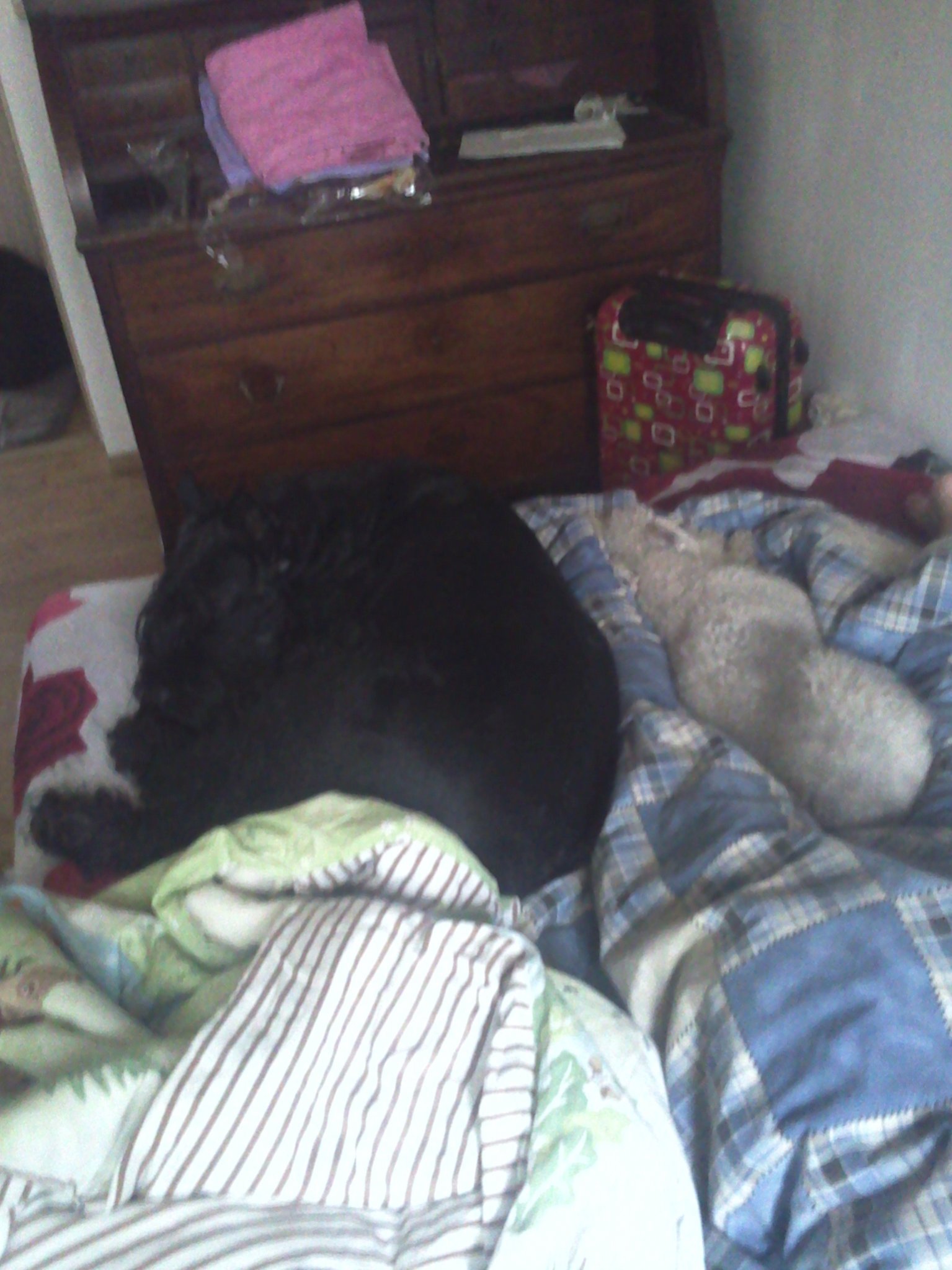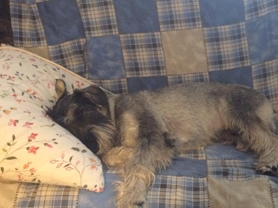 Айка (на голове), Фил (с боку), ризеняка ( в другого боку), бидлингтон терьер на ногах и уипет в конце кровати=))) Но вообще Фил и Айка могут спать и в боксе (сама делала) |