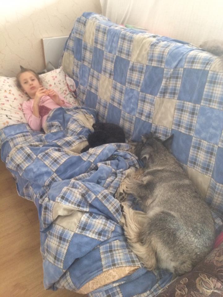 А мы не спим с собаками, большие они очень. Если они лягут на кровать, нам придется спать на коврике в прихожей!))) Поэтому они ждут, когда постель уберут, и только тогда запрыгивают на покрывало. А вечером мы их сгоняем с кровати. Я прошу Олега, чтобы он Шагане попросил покинуть лежбище, а она с таким недовольным видом покидает кровать, что это надо видеть! В выходные они приходят к нам и здороваются, Шагане садится в "зайчика" и дает нам по лапке, а эмоциональная Фрея лезет на кровать, только задние ноги на полу остаются.