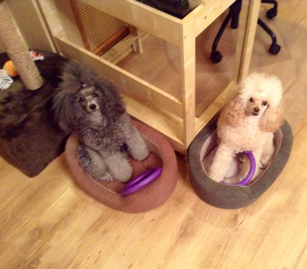 Про то,кто где у нас спит. Первого своего пуделя Чипку мы в своё время не смогли переубедить и он все свои почти 17лет жизни так и спал с нами в кровати. Второй своей пуделице Патти(которой сейчас уже 11 лет) мы как-то сразу разрешили доступ в кровать и так с тех пор она и спит.А вот мою теперешнюю младшенькую пуделишку Зару,я со щенячества решила приучать к лежанке,в итоге, лежанку она свою очень любит,с удовольствием спит в ней ночами,да и днём тоже с удовольствием может в ней подремать,хотя днём мы не против и Зара с удовольствием приходит поваляться на кровать/диван/кресло,а вот с вечера я ложусь и ей говорю"Зара,иди на место" и она уходит в свою лежанку(а часто и без моего напоминания туда уходит) роет там себе норку и с удовольствием спит там всю ночь,приэтом она ни в коем случае,не чувствует себя обиженной или несчастной-просто она привыкла,что ночью она всегда спит не у меня в кровати,а в своей лежанке(и это очень удобно и ей и мне)а ещё,Зара очень любит свои контейнеры-переноски. Может и дома уйти подремать в своём контейнере и в машине прекрасно ездит в контейнере,считает контейнер своим домиком :-)