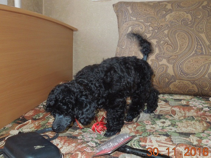 Самая смелая на сегодня-в играх задирает всех щенков,первая летит на зов,готова играть весь день,но одиночества не любит). Стрижётся спокойно,доверяет рукам полностью),очень гордо держит в движении головку и высокий хвостик)...