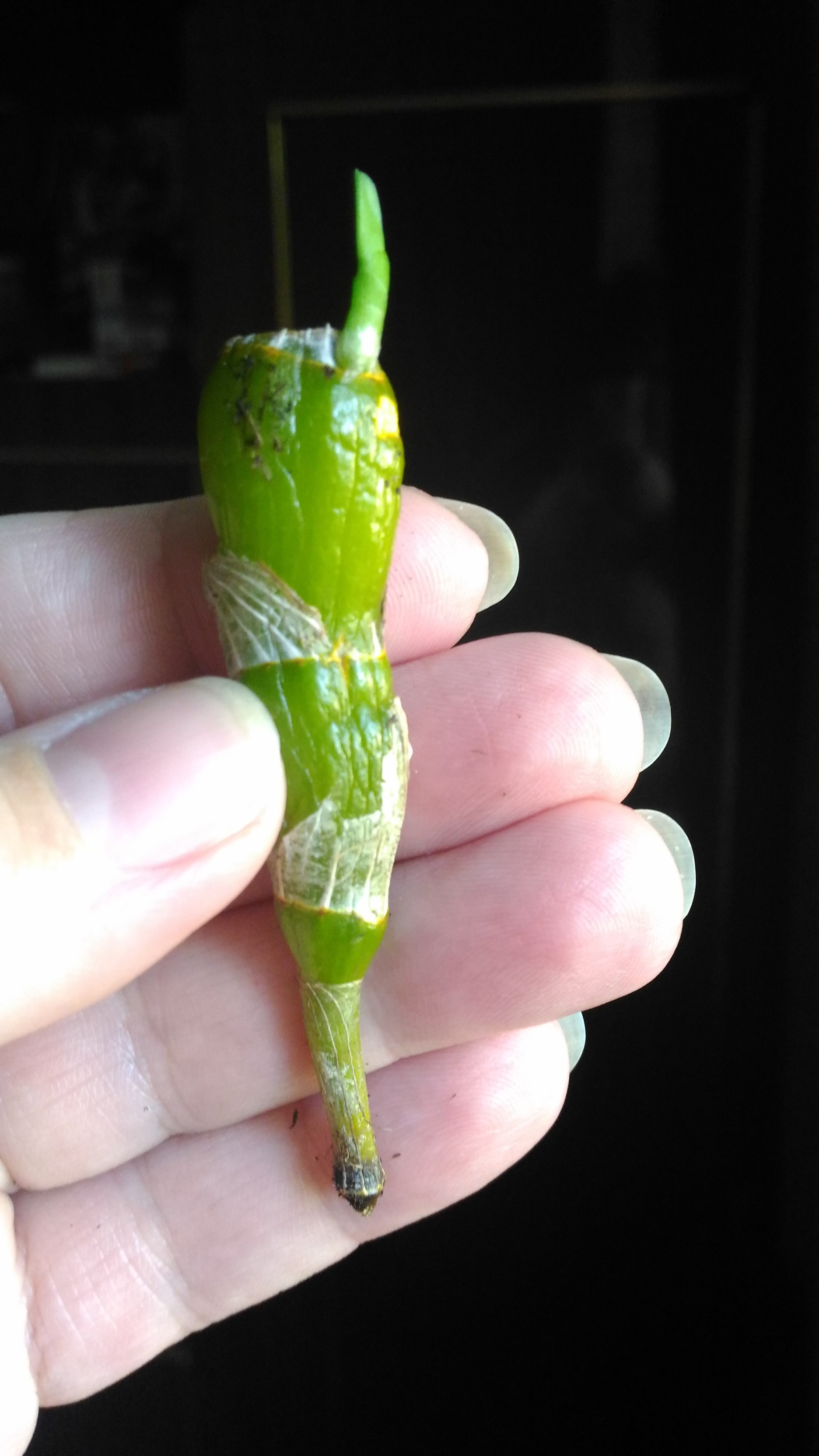 Это кусок ствола орхидеи дендробиум нобиле, который я отрезала, чтоб не торчал из земли некрасиво. Отрезала и положила на подоконник. Этот пенёк лежал лежал, а потом, когда я таки решила его выбросить, увидела крохотный пупырышек, потом пупырышек стал расти и на нем уже 2 маленьких листика :) Пенёк валяется в горшке с фикусом уже пятый месяц, сейчас стал желтеть, а листики растут, вот такой эксперимент у меня :)