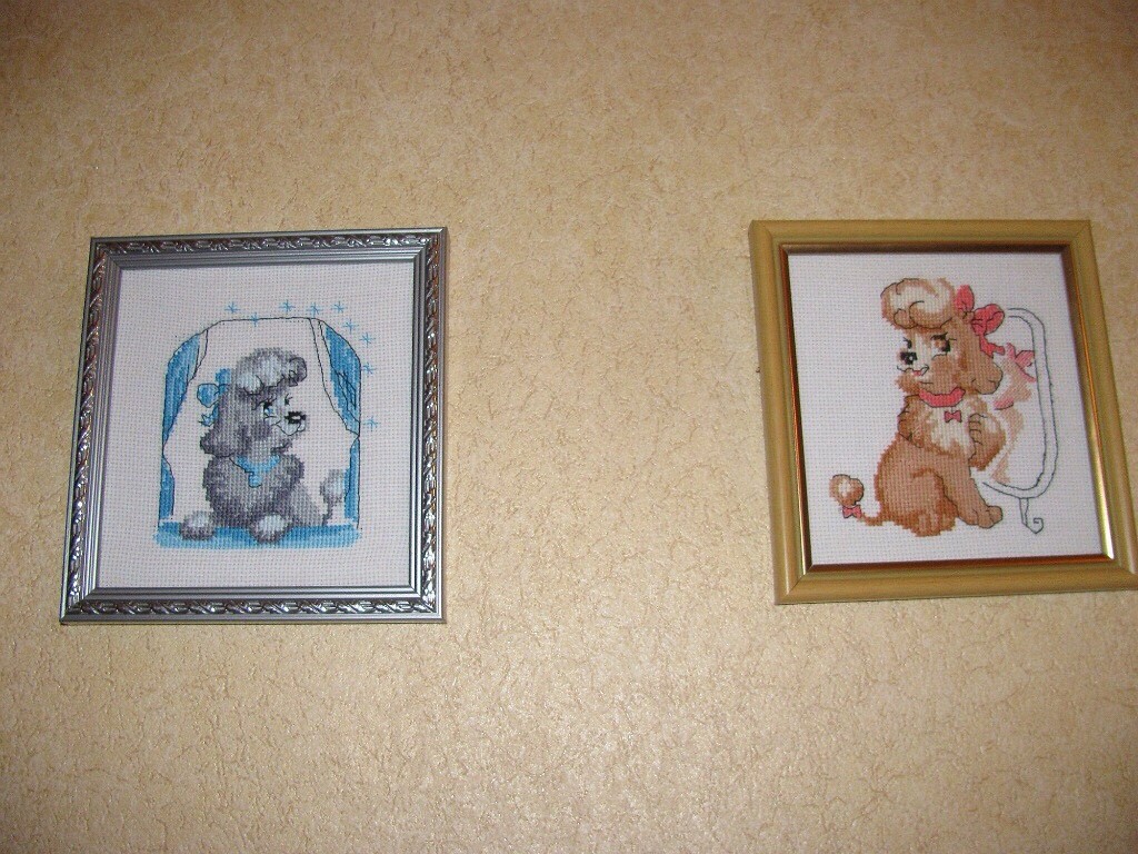 А это некоторые работы нашей мамы. Раньше она очень много вышивала, может и сейчас начнет благодаря нашей елочки. Вышивки пуделей живут у пуделистов. Анютины глазки даже наша Санта Наташа в альбоме с фотографиями разметила.