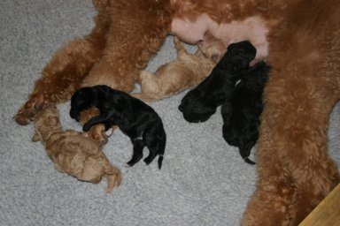 Девочки, помните мы как-то обсуждали Asia (Lumiere Farleys D Just A Dream), которая родилась "серебристой" и потом набрала окрас, посмотрите какой у неё до сих пор окрас после двух вязок.... это её новый помёт от чёрного очень красивого кобеля Am. Cdn Ch. Carrington All Fired Up (3 чёрных и 2 абрикосовых мальчишек)