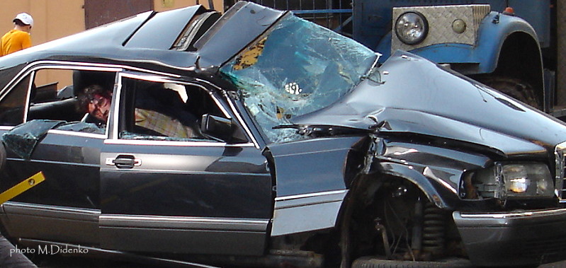 , а замечательный, новенький мерседес, который смяли грузовиками до такого состояния. Вместо актера за рулем сидел муляж, который, кстати, остался почему-то без повреждений.