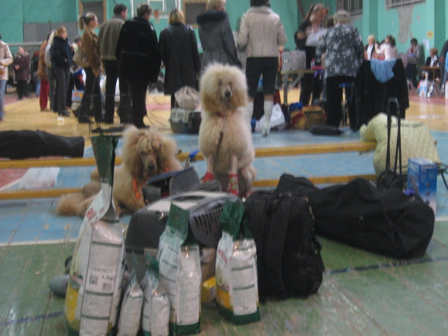 на фото большие абрикосы Злато Сибири Феб - КЧК, ЛПП, лучший большой и R.BIS и Злато Сибири Забава - ЮКЧК, ЛЮ в боксе сидят два красных миника Мэджик Мистери Майа Мелиан - КЧК, ЛПП 3я в миниках и Мэджик Мистери Варкрафт - ЮКЧК, ЛЮ, BISj - 3 на переднем плане выигранный корм, прызы и кубки уже упакованы... а у нас ТЕЛЕГА ПОЛОМАЛАСЯ!!! было сильно весело...