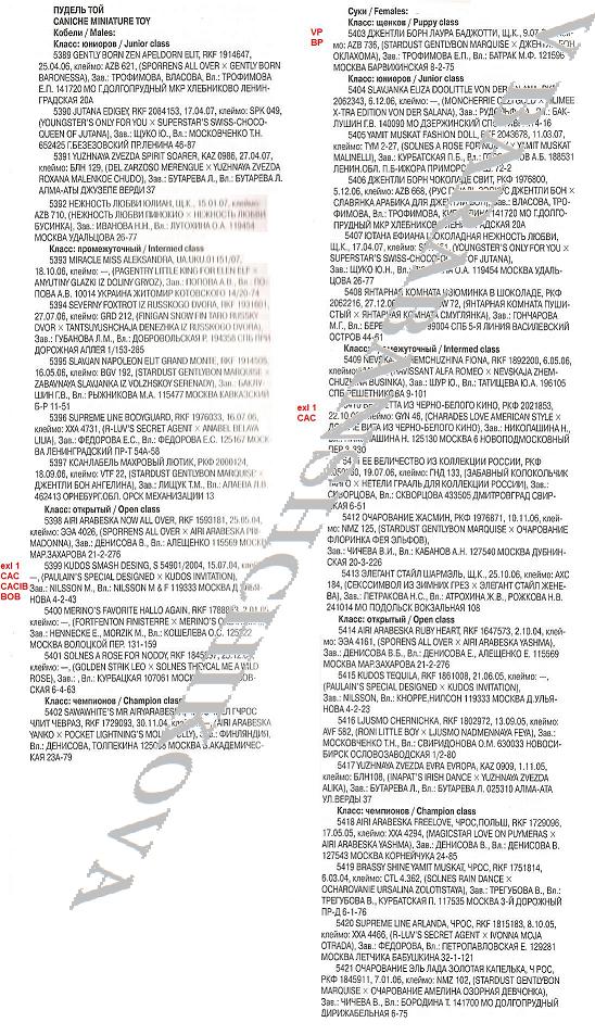 . Нинсанна, в миниатюре кобели открытый класс 4954 Airi Arabeska HIGHFLIYER-3 (так его кличка пишется), Inapat`s TERRANO 4. Суки открытый класс 4966 Airi Arabeska BRILLIANT NIGHT СW, CAC. Свой фотоаппарат даже не достала из сумки ...Повешу пару фоток Jasenak Star Wаrs после стрижки к Евразии. Жаль, что послушала Наташу (совладельца) и записала во взрослый класс, не готов еще мальчишка. В юниоры или в интермедия в самый раз. Только из юниоров вышел. Оба дня был 3 в классе. _______________________________________