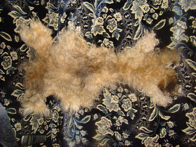 Вся эта "стрижка"производилась ручной машинкой.....,жаль,что не удалось хорошо заснять ушко,оно состриглось колпачком......Отмечу,что при такой запущености ,кожа у собачки была вполне здоровой.Десять лет назад,я снимала"шкурку"с королевича,так там ,ужас,все было ,вся кожа ,в дырах гнойных.........,а у хозяйки маникюр в два см.Пришлось общаться с этой красавицей на особенном русском наречии............