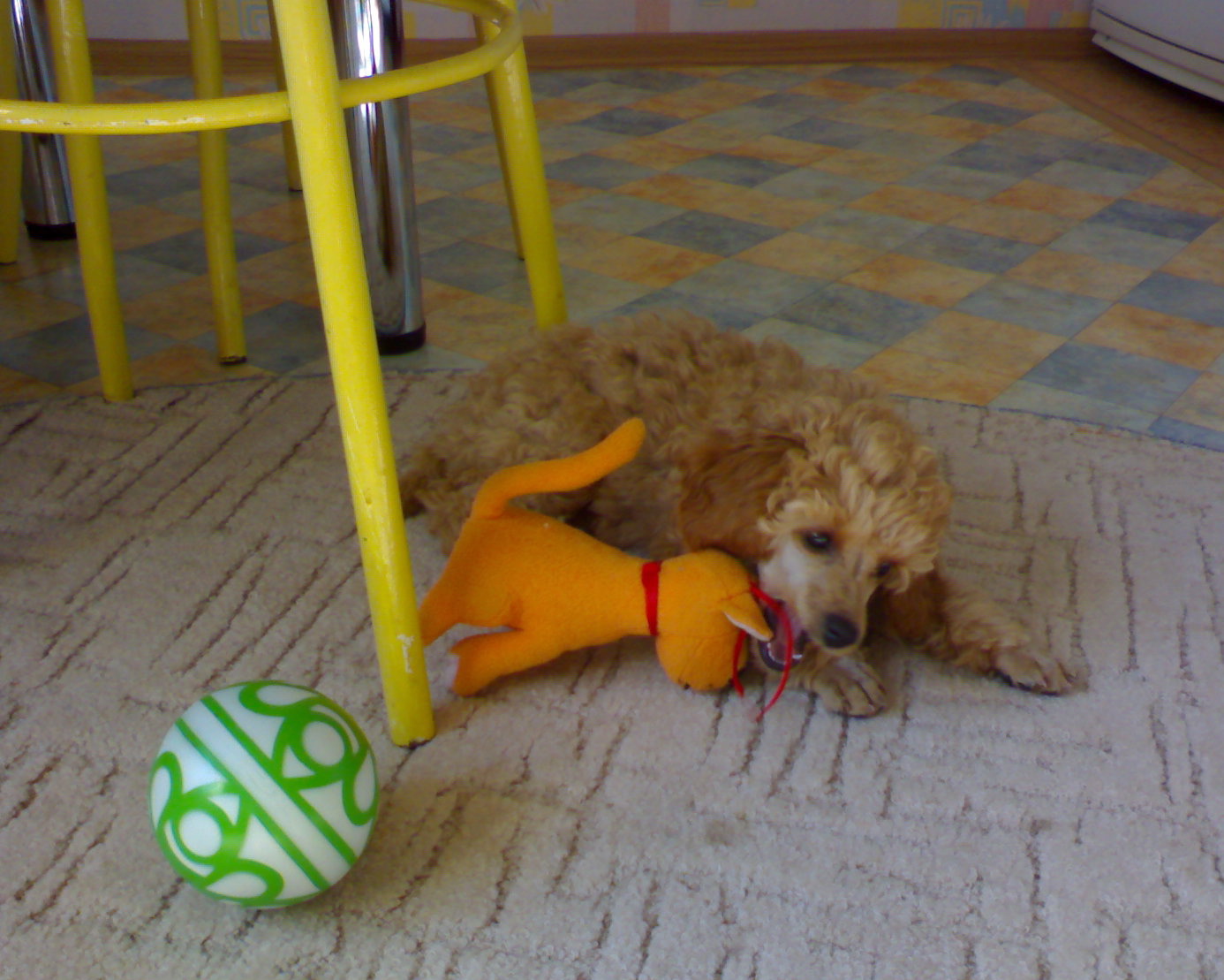 Безвременно потеряв нашу малую черно-белую мы кинулись искать щенка, потому что ...у меня было мнение, что завести после смерти любимой собаку другую собаку, это не предательство, а наоборот - следование выбранному пути. То есть если ты можешь сделать счастливой ещё одну собаку, можешь вложить в неё душу и дать свою любовь, то в память о потерянном друге нельзя замыкаться, надо брать и воспитывать щенка. Обзвонили все городские клубы - не оказалось ни одного зарегистрированного пуделя. То есть официально в городе пуделей НЕТ. А брать НЕофициального, из которого неизвестно что вырастет, не хотелось. А в другой город тогда поехать не было возможности. По почти мистическому стечению обстоятельств мы встретились с разведенцем американских кокеров и абрикосовых пуделей. Она предлагала помочь с документами на щенка, но для нас это был не самый принципиальный вопрос. Знаю только, что мама наша из какого-то Московского питомника, с родословной, потому что они на выставки ездят. В помете ещё была красная девочка и абрикосовый мальчик чуть потемнее нашей девочки. Нашу малышку мы увидели первый раз в 11 дней (я уж больно сильно умоляла, и хозяйка девочки сдалась - дала посмотреть), я сразу выбрала её, а потом хазяйка нашей мамы позвонила и сказала, что наша девочка посветлела на третьей неделе после рождения. Мы ещё шутили, что она побоялась, чтобы мы её не перепутали и забрали именно её :-)