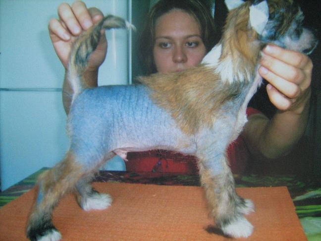 20.04.2005г у Люси рождается 4 кобеля: 2 голых и 2 пуховика, все мальчишки разъехались по другим городам. 2 щенка живут в Омске, это голый Манзана де Оро Рандеву |