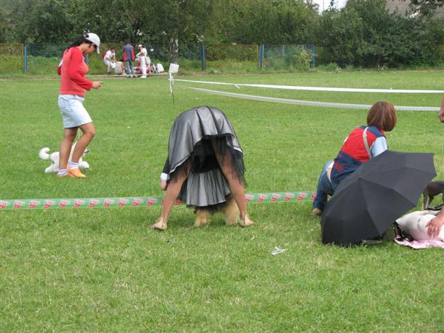 Ну вот такая тётя, всегда что-нить яркое на себя, броское надевает :) Много выставляет собак клиентов, я её почти на всех выставках видела. Жаль не фотала...... Вера, фотки - улёт Мне вот интересно, каким образом в таком наряде можно выставлять чиха?! К нему же наклоняться придётся!