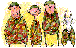 Говорила сестрица Аленушка братцу Иванушке: не пей воды из козьего копытца! Не послушал ее братец Иванушка, выпил и превратился в козленка. Что только не делала сестрица Аленушка - и по больницам его возила, и гомеопатией лечила и к экстрасенсам обращалась - ничего не помогало. А как стукнуло Иванушке 18 - забрали его в армию. Нелегко ему там пришлось поначалу - сослуживцы дразнили, старослужащие обзывали. Ну и конечно вид не по уставу - отсюда постоянные наряды, взыскания. Но все-таки армия сделала из него человека. Зря ее ругают. |