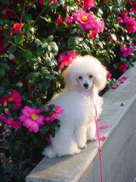 Это тот зимний цветущий кустарник служит фоном для собачки.Цветы бывают самых различных вариантов : интенсивно-розовые и бледно-розовые,белые и красные,красно-пёстрые тоже встречаются,иногда встречаются кремоватые.Фото сделано в январе.
