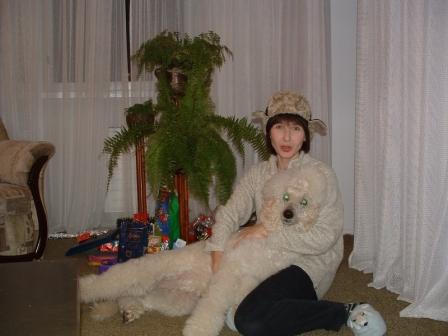 В свитере это я, в прошлом году, хотя вязала его для дочери. Мы тогда внучека ждали. А шерсть на свитер собирали со всех. Сначала я Триш обстригла-не хватает. Обзвонила знакомых, написала на форум Эстонского пудель-клуба....... Короче эта штучка теплая весит больше килограмма.