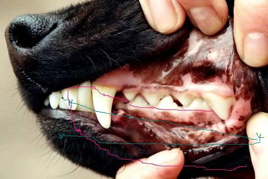 Это ж рисовать надо...А то непонятно будет...Если у собаки удалены ВСЕ зубы изменяется лицевой угол нижней челюсти( вспомните старушек без зубов-проваленый рот,выдвинутый вперед подбородок) Угол становится острее,а нижняя челюсть КАЖЕТСЯ короче.